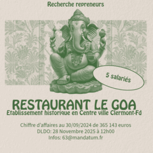 MANDATUM recherche des candidats repreneurs pour un fonds de commerce réalisant restaurant, plats à emporter connu sous l’enseigne GOA situé à CLERMONT-FERRAND (63000).