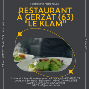MANDATUM recherche des candidats repreneurs pour un fonds de commerce de restauration, traiteur et d’activités connexes, connu sous l’enseigne BISTROT KLAM situé à GERZAT (63360).