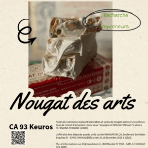 Plus d’informations sur 63@mandatum.fr, (Réf Mandat N° 6956 – SARL LE NOUGAT DES ARTS)