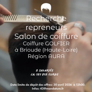 MANDATUM recherche des candidats repreneurs pour un fonds de commerce réalisant salon de coiffures hommes, femmes, enfants et négoce d’accessoires. connu sous l’enseigne COIFFURE GOLFIER situé à BRIOUDE (43100).
