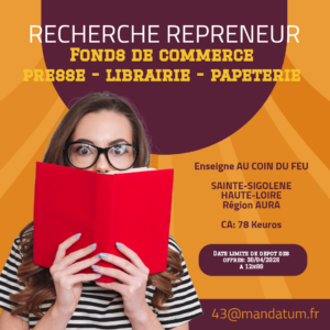 MANDATUM recherche des candidats repreneurs pour un fonds de commerce réalisant activités de presse, papeterie, librairie, jeux, loterie, fabrication de clés, vente de produits alimentaires et de boissons non alcoolisées connu sous l’enseigne AU COIN DU FEU situé à SAINTE-SIGOLENE (43600).