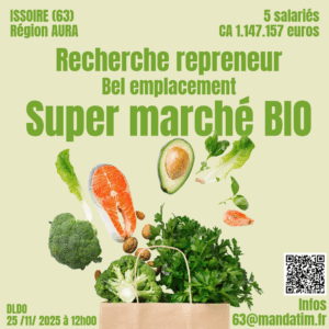 MANDATUM recherche des candidats repreneurs pour un fonds de commerce réalisant commerce de détail alimentaires et autre en magasin spécialisé bio et diététique et plus généralement, toutes opérations industrielles, commerciales, financières, mobilières ou immobilières, se rapportant directement ou indirectement à l’objet social ou susceptibles d’en faciliter le développement ou la réalisation situé à ISSOIRE (63500).
